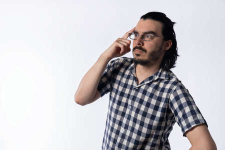 funny curly guy in a white t-shirt glasses emotions studio fashion