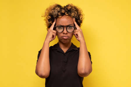Young black man in wireless headphones rubbing his temples isolated over grey wall