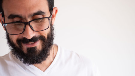 Close up of a Middle eastern man with beard an glasses, white t-Shirt. the man is looking down and smiling