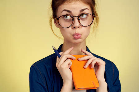 Portrait of a blonde in glasses on a brick wall background. A woman walks around the city. The smiling girl. Lips with red lipstick.