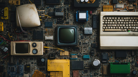 An artistic arrangement of vintage technology featuring retro electronics and circuit boards, perfect for use in creative projects and designs.