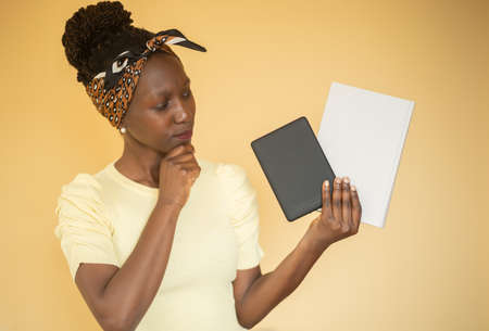young woman trying to decide between printed book vs e-book
