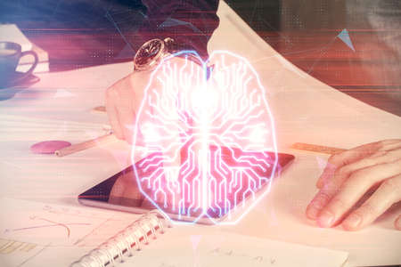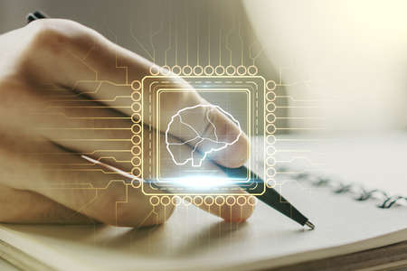 Creative artificial Intelligence concept with human brain sketch and man hand writing in diary on background. Double exposure