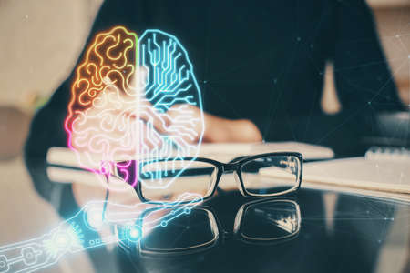 Double exposure of woman working on computer andhuman brain hologram drawing. Top View. Ai concept.