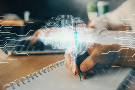 Double exposure of writing hand on background with brain hologram. Concept of learning.