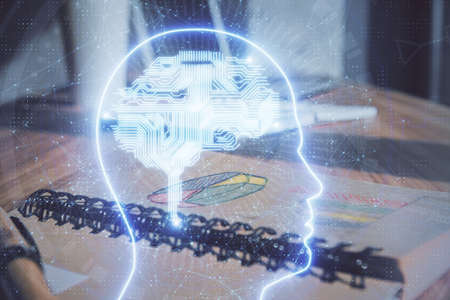 Multi exposure of brain drawings and desk with open notebook background. Concept of AI
