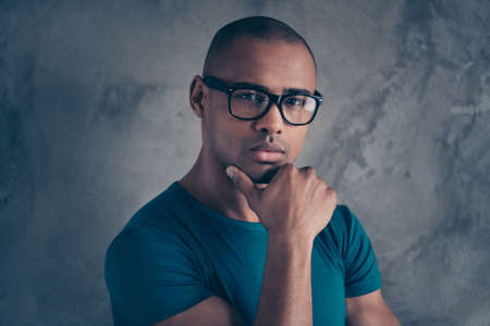 Close-up portrait of his he nice lovely cute attractive virile good-looking pensive guy wearing blue t-shirt modern device gadget digital watch solution isolated over gray industrial concrete wall.