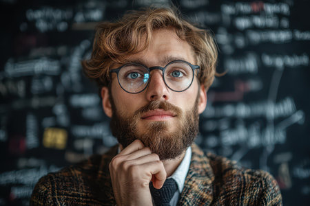 A young man with glasses and a beard thoughtfully gazes while resting his chin on his hand surrounded by chalkboard equations in a study room.