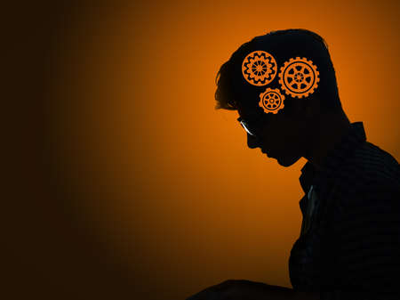 Silhouette of human head, chalk on the wall, gears in head, brainstorming, extraordinary thinking and intelligence