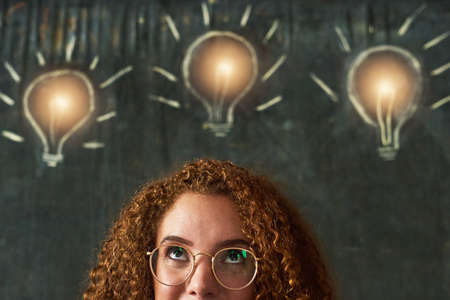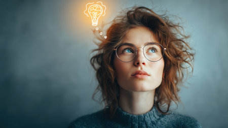 Thoughtful young woman surrounded by soft light, glowing bulb and floating image symbolizing a new idea above her head, modern minimal design, no text