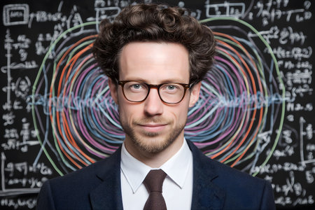 A surprised man with glasses and a beard holds a light bulb against a chalkboard filled with equations, symbolizing creativity and inspiration in science and education.