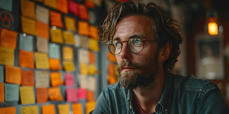 A young man with glasses and a thoughtful expression gazes into the distance, embodying deep contemplation in a softly lit environment that evokes calm and reflection.