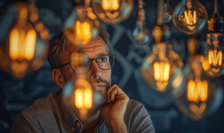 Creative man in glasses surrounded by glowing light bulbs, symbolizing innovative ideas and brainstorming in a magical, dreamlike setting with smoke and colors.