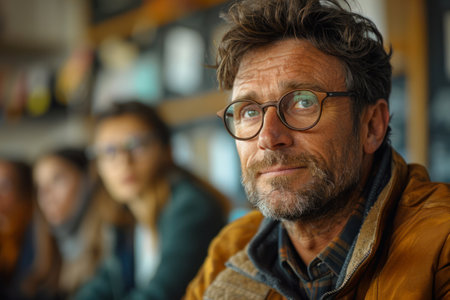 Engaging close-up portrait of a young Croatian male teacher in an interactive classroom setting