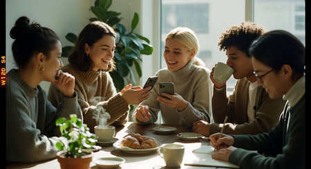 A group of friends enjoying coffee and pastries in a cozy cafe, laughing and sharing moments, with plants and natural light in the background