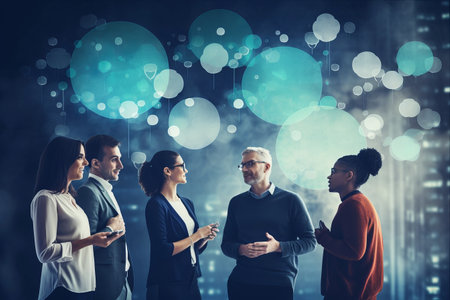 A diverse group of smiling business professionals sit around a table with colorful speech bubbles floating above, representing active communication and collaboration. - Generic AI Image