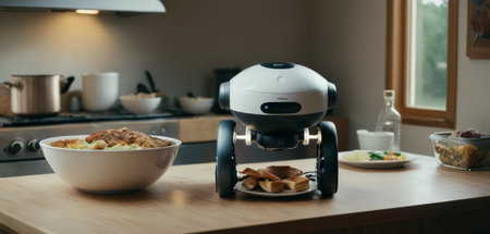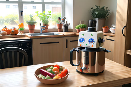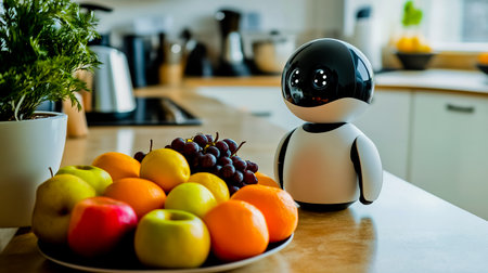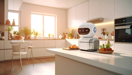 In a bright, sun-drenched kitchen, a friendly AI robot assistant stands ready on the counter. This vision of the future showcases smart home technology seamlessly integrated into daily life, bringing convenience and innovation to the modern household.