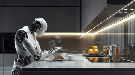 A robot seated at a sleek kitchen counter is enjoying a meal while the morning light illuminates the modern space filled with utensils and fruits.