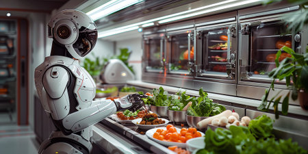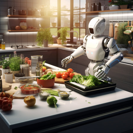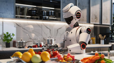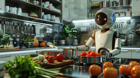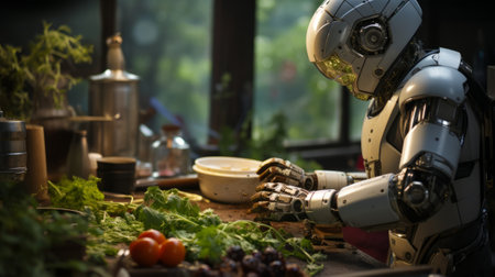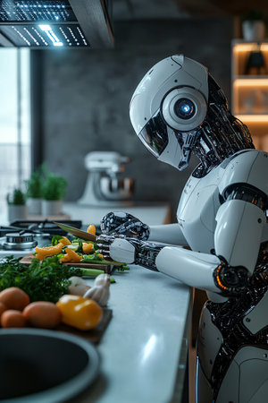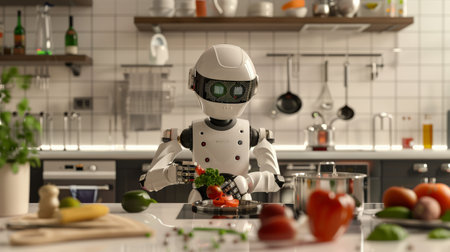 A futuristic robot chef skillfully prepares a meal in a modern kitchen, surrounded by fresh vegetables and cooking utensils.