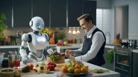 Robot domestic assistance cooking vegetarian dinner at the kitchen. Artificial intelligence helping people with housework. Futuristic concept. Generated AI content.