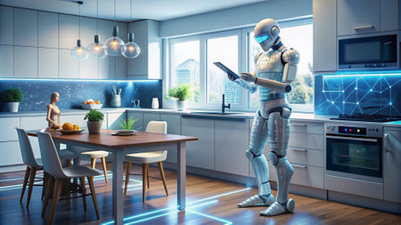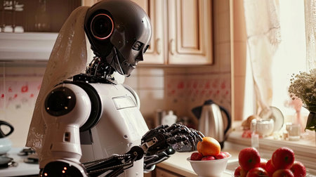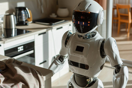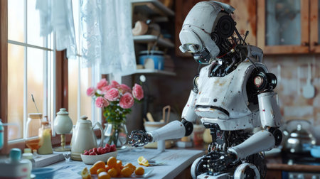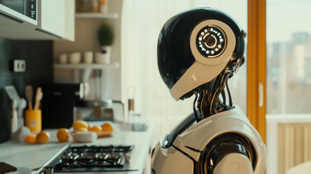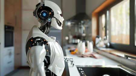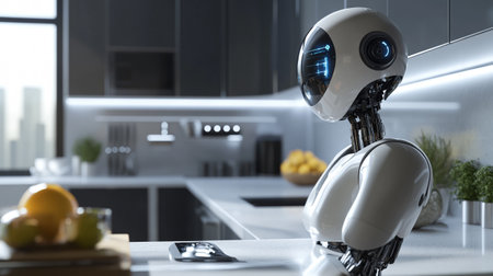 Advanced Robot with White Body in Modern Kitchen.