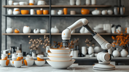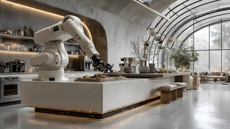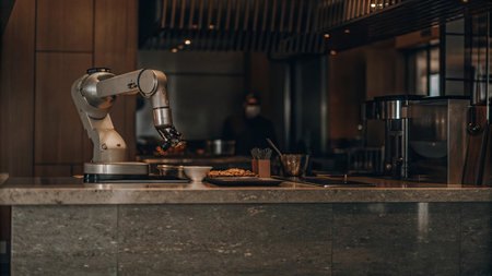 Robotic arm in modern kitchen automating food preparation in urban restaurant.