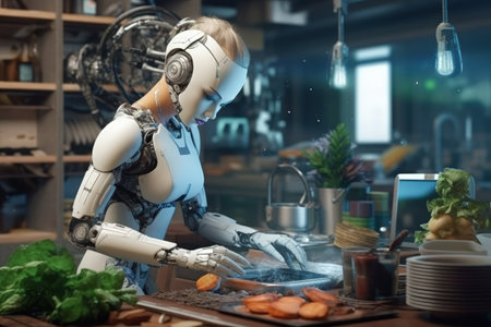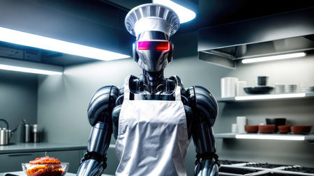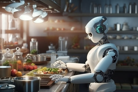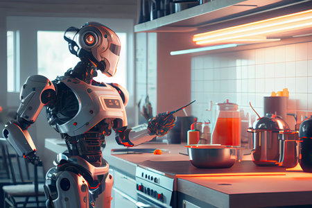 Robot cooking in the kitchen. Concept of artificial intelligence and machine learning.
