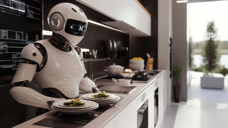 A humanoid robot chef expertly maneuvers around a sleek, modern kitchen, preparing a meal with state-of-the-art culinary equipment.
