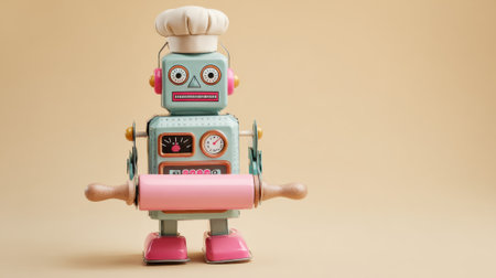A cheerful robot chef stands on a kitchen countertop holding a rolling pin. Its colorful design features a chef's hat bright buttons and a friendly expression adding fun to cooking.