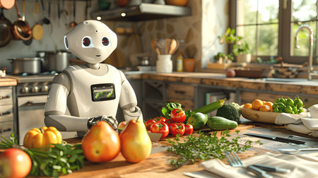 Friendly robot assistant with touchscreen on its chest, deftly chopping vegetables. Modern kitchen, on the table are fresh fruits, herbs and kitchen utensils.