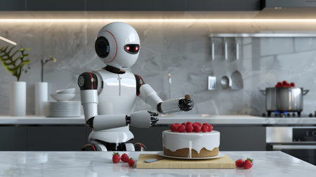 Humanoid robot decorating a cake with strawberries in a sleek kitchen. Advanced AI enhancing home baking