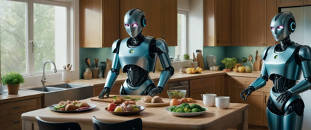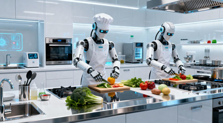 Two robot chefs work together in a bright, clean kitchen, preparing a variety of fresh vegetables for a meal