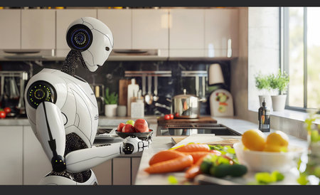 Humanoid robot preparing a meal in modern kitchen with fresh vegetables. Advanced AI and robotics in home automation.