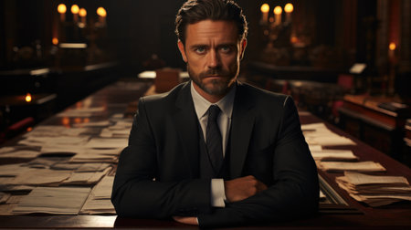 Portrait of a serious businessman sitting at the table in a courtroom.
