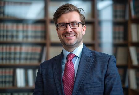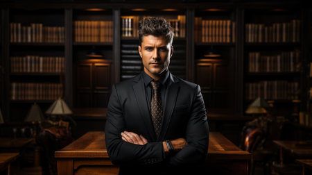 Lawyer is standing in his office library with his arms crossed, smiling confidently