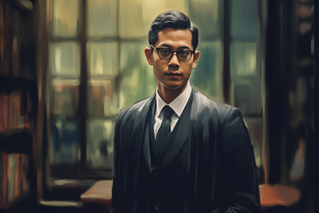 A distinguished professor in a suit poses confidently before a large bookshelf brimming with books, emanating wisdom and experience.