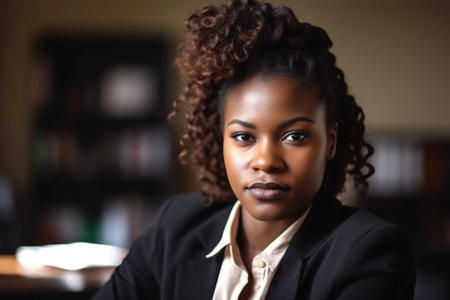 Portrait of a young black female lawyer smiling and happy at her workplace in the office. African lawyer, technologist and professional face, female lawyer and legal consultant in a law firm.