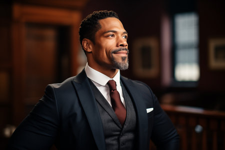 Dramatic portrait of bold smiling black lawyer with beard in a black suit in legal office with warm ambient lighting.