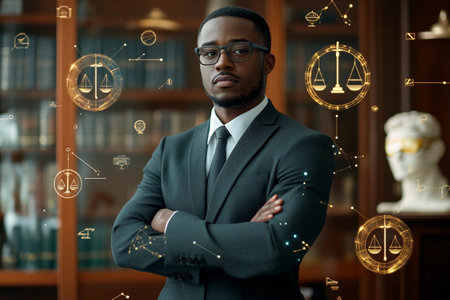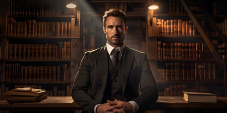 A poised lawyer in a tailored suit stands confidently with arms crossed in a library filled with law books. Surrounding him are glowing symbols representing justice and legal knowledge.
