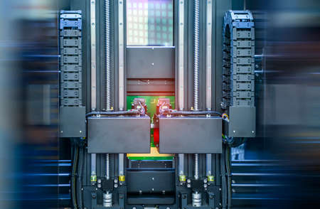 ICs. Chip manufacturing. Printer for electronic circuit boards. Manufacture of electronic equipment. Industrial machine. Robot prints chips.