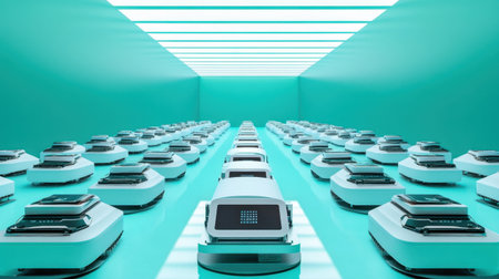 This captivating image depicts a futuristic scene filled with robots arranged in a uniform design, showcasing innovation in automation within a sleek aquamarine space.