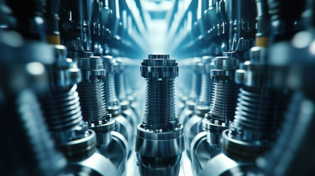 This image showcases a detailed view of precision engine components arranged in a high-tech manufacturing environment, highlighting the engineering intricacies and advanced technology involved in modern machinery production.