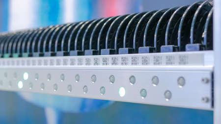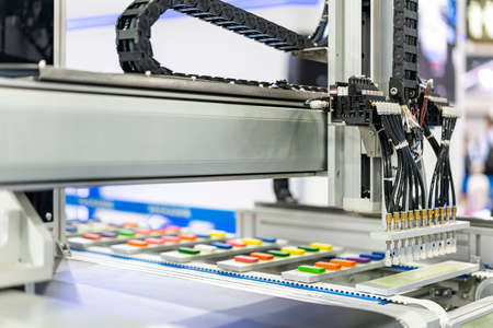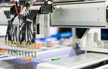 Assembly of computer circuit board - automatic SMD pick and place machine during work at factory. Automated technology, industrial, robotic, electronic, production, manufacturing concept