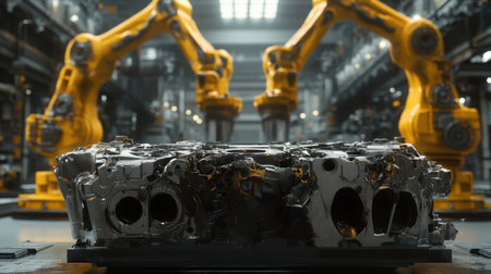This image depicts a high-tech robotic factory featuring advanced automation technology. The focus is on metallic components and robotic arms engaged in precise industrial processes.