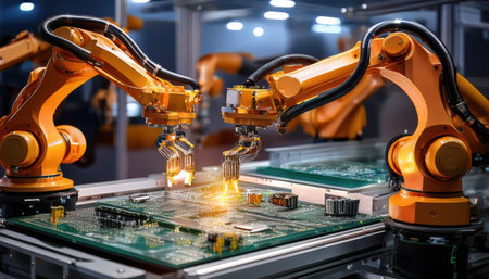 Robots with orange grips efficiently assemble circuit boards and components in a high-tech manufacturing environment.