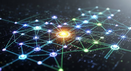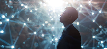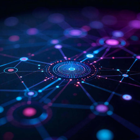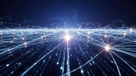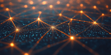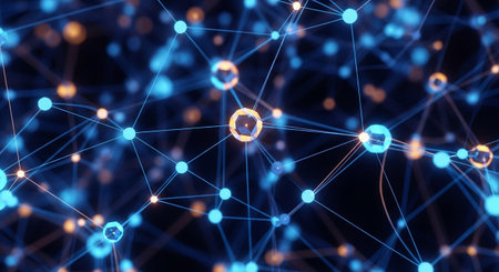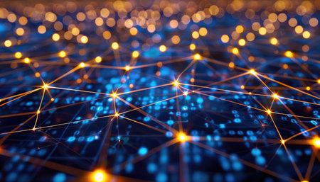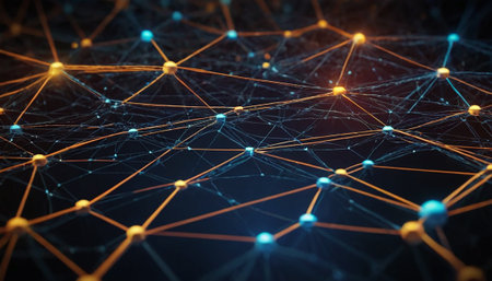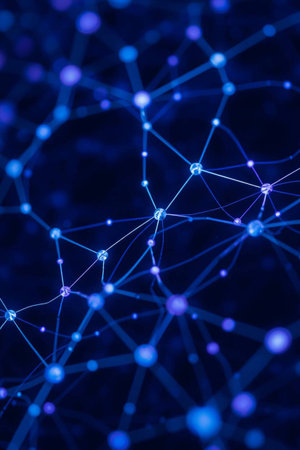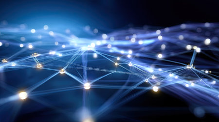 Abstract illustration of a glowing network with nodes and lines on a dark blue background.