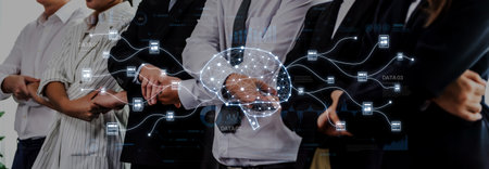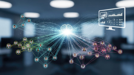 A complex network visualizes connections, possibly representing data analytics or artificial intelligence. Lines radiate from a central brain symbol to multiple nodes containing profile icons, with a data display in the upper right. The composition uses bright, contrasting colors and a blurred office background, suggesting technology and collaboration, suitable for various commercial uses.