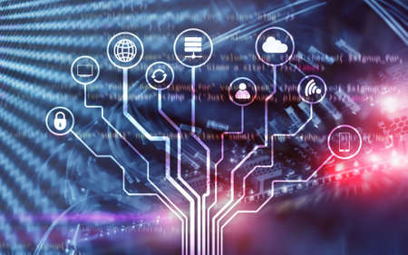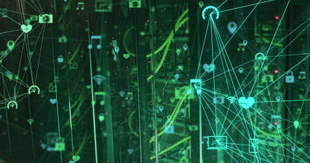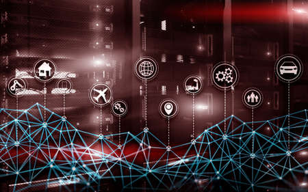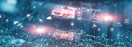 Server Room ICT information communication technology wireless internet connection big data processing center. IOT internet of things.