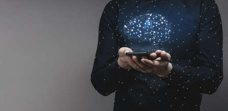 A hand of a businessman is holding a mobile phone in order to connect a digital wallet. This is an example of online banking, online finance, e-commerce, the digital wallet, financial economy, and.