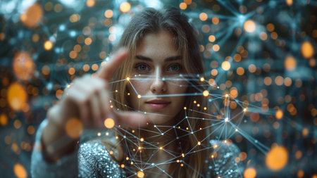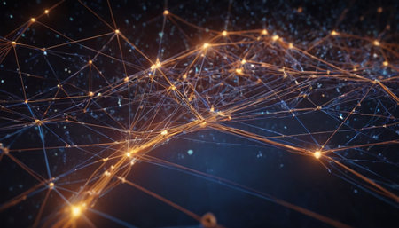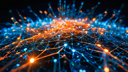 Bright connections form an intricate pattern across a dark background, showing technology and design.